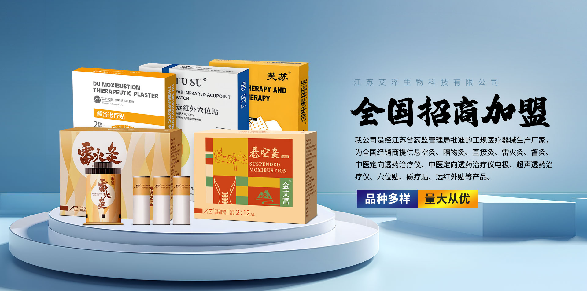 我们的产品有敷苏牌穴位贴敷治疗贴、歌泽牌隔物灸治疗贴、中泽牌中医定向透药治疗仪用电极片、艾熨牌烫熨治疗贴、艾敷牌磁针治疗贴、敷通牌磁热治疗贴、雪苏牌物理退温敷料和冷艾牌冷湿敷法贴等。